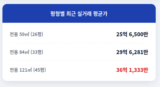 ● 전용 59㎡ (26평형): 평균 25억 6,500만 원. 최고 27.7억까지 거래되며 중소형 평형의 강세를 보여줍니다.