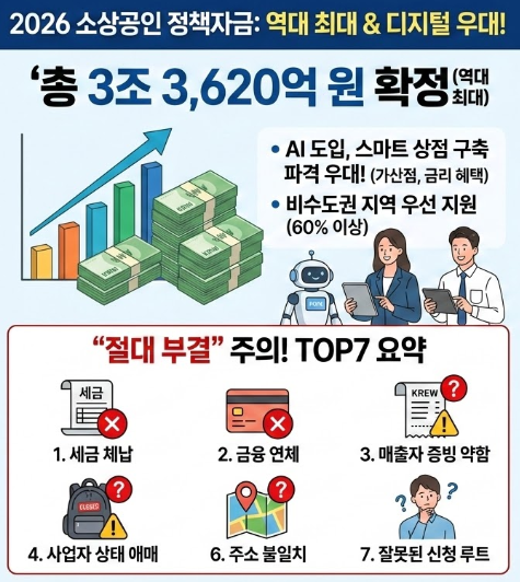 2026년 소상공인 정책자금은 역대 최대 규모와 함께 '디지털 전환 우대'라는 혁신적인 기회를 제공합니다. 이 자금은 단순히 '정보를 아느냐'를 넘어 준비가 되어 있느냐(세금·연체·증빙·주소·루트)가 결과를 가릅니다. 특히 부결 사유 TOP7만 먼저 제거하고, 보증/직접대출 루트를 확정한 뒤 서류를 폴더로 정리하면, 같은 조건이어도 진행 속도와 체감 난이도가 확 달라집니다. 2026년 1월 5일부터 신청이 시작되니, 미리 준비하셔서 성공적인 정책자금 확보와 사업 성장의 기회를 잡으시길 바랍니다.